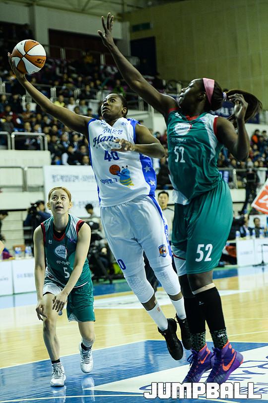 [점프볼=춘천/유용우 기자] 16일 춘천 호반체육관에서 열린 'KDB생명 2015-2016 여자프로농구' 춘천 우리은행과 KEB하나은행의 챔피언결정전 1차전 경기,우리은행 스트릭렌이 수비를 돌파하며 레이업을 시도하고 있다.