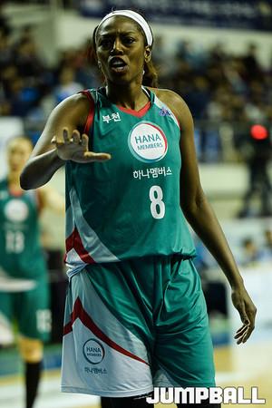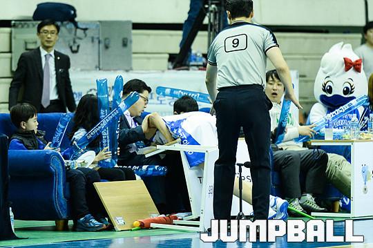 [점프볼=춘천/유용우 기자] 16일 춘천 호반체육관에서 열린 'KDB생명 2015-2016 여자프로농구' 춘천 우리은행과 KEB하나은행의 챔피언결정전 1차전 경기,우리은행 임영희가 루즈볼을 살리기 위해 몸을 던졌지만, 관중석 테이블과 부딪히며 고통을 호소하고 있다.