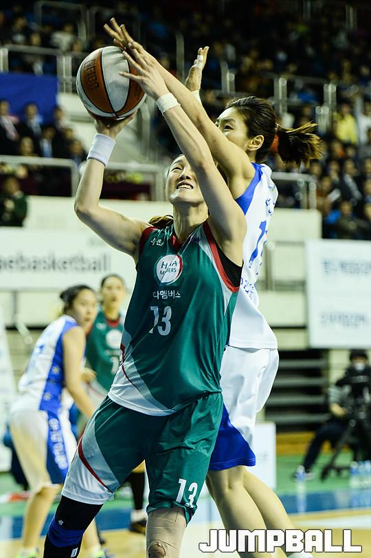 [점프볼=춘천/유용우 기자] 16일 춘천 호반체육관에서 열린 'KDB생명 2015-2016 여자프로농구' 춘천 우리은행과 KEB하나은행의 챔피언결정전 1차전 경기, KEB하나은행 김정은의 공격을 우리은행 임영희가 블록으로 수비하고 있다.