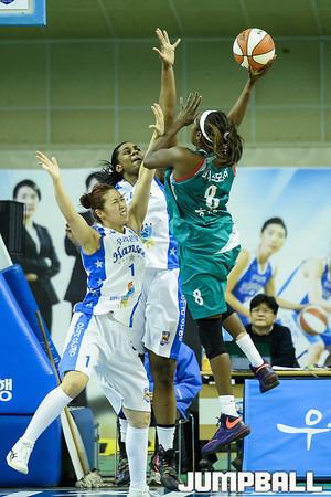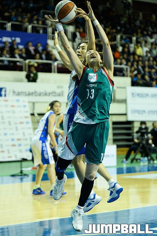 [점프볼=춘천/유용우 기자] 16일 춘천 호반체육관에서 열린 'KDB생명 2015-2016 여자프로농구' 춘천 우리은행과 KEB하나은행의 챔피언결정전 1차전 경기,, KEB하나은행 김정은의 공격을 우리은행 임영희가 블록으로 수비하고 있다.