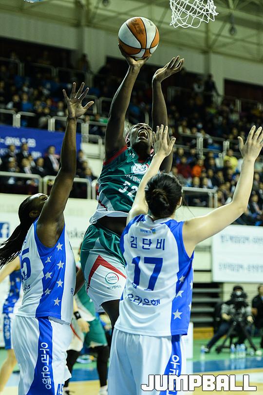 [점프볼=춘천/유용우 기자] 16일 춘천 호반체육관에서 열린 'KDB생명 2015-2016 여자프로농구' 춘천 우리은행과 KEB하나은행의 챔피언결정전 1차전 경기, KEB하나은행 첼시 리가 슛을 시도하고 있다.