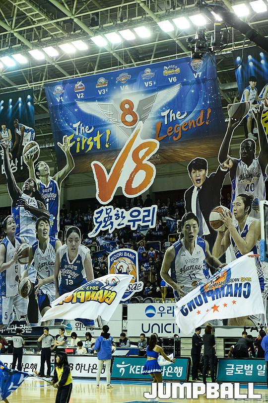 [점프볼=춘천/유용우 기자] 16일 춘천 호반체육관에서 열린 'KDB생명 2015-2016 여자프로농구' 춘천 우리은행과 KEB하나은행의 챔피언결정전 1차전 경기, 우리은행 홈팬들이 라이징네트를 이용해 홈 응원을 펼치고 있다.