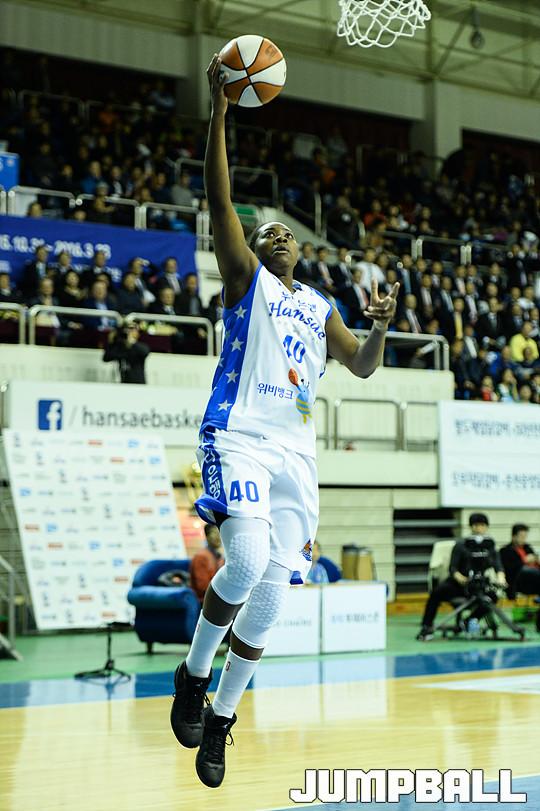 [점프볼=춘천/유용우 기자] 17일 춘천 호반체육관에서 열린 'KDB생명 2015-2016 여자프로농구' 춘천 우리은행과 KEB하나은행의 챔피언결정전 2차전 경기, 우리은행 스트릭렌이 속공 레이업으로 손쉬운 득점을 올리고 있다.