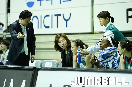 [점프볼=춘천/유용우 기자] 17일 춘천 호반체육관에서 열린 'KDB생명 2015-2016 여자프로농구' 춘천 우리은행과 KEB하나은행의 챔피언결정전 2차전 경기, KEB하나은행 신기성 코치가 김정은에게 작전을 지시하고 있다.