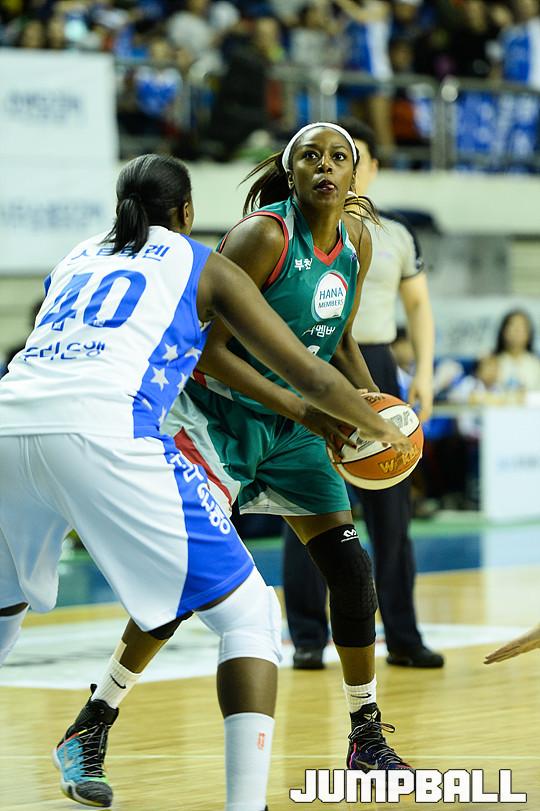[점프볼=춘천/유용우 기자] 17일 춘천 호반체육관에서 열린 'KDB생명 2015-2016 여자프로농구' 춘천 우리은행과 KEB하나은행의 챔피언결정전 2차전 경기, KEB하나은행 버니스 모스비가 공격 기회를 옅보고 있다.