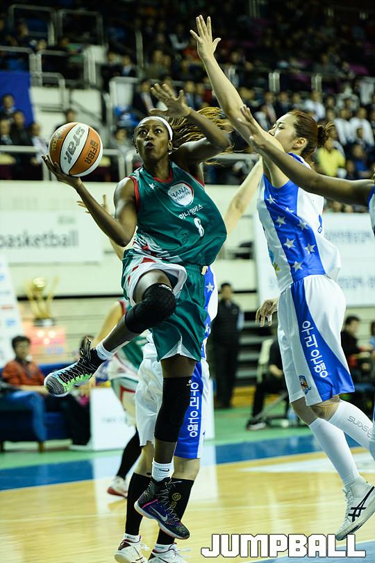 [점프볼=춘천/유용우 기자] 17일 춘천 호반체육관에서 열린 'KDB생명 2015-2016 여자프로농구' 춘천 우리은행과 KEB하나은행의 챔피언결정전 2차전 경기, KEB하나은행 버니스 모스비가 레이업을 시도하고 있다.