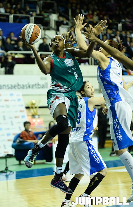 [점프볼=춘천/유용우 기자] 17일 춘천 호반체육관에서 열린 'KDB생명 2015-2016 여자프로농구' 춘천 우리은행과 KEB하나은행의 챔피언결정전 2차전 경기, KEB하나은행 버니스 모스비가 레이업을 시도하고 있다.