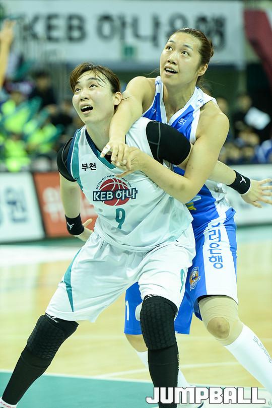 [점프볼=부천/유용우 기자] 20일 부천 실내체육관에서 열린 'KDB생명 2015-2016 여자프로농구' 부천 KEB하나은행과 춘천 우리은행의 챔피언결정전 3차전 경기, 우리은행 양지희와 KEB하나은행 백지은이 리바운드를 준비하며 몸싸움을 하고 있다.