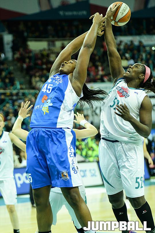 [점프볼=부천/유용우 기자] 20일 부천 실내체육관에서 열린 'KDB생명 2015-2016 여자프로농구' 부천 KEB하나은행과 춘천 우리은행의 챔피언결정전 3차전 경기, 우리은행 굿렛과 KEB하나은행 첼시 리가 리바운드 경쟁을 벌이고 있다.