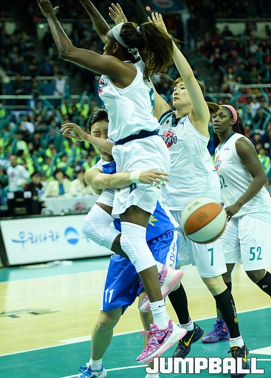 [점프볼=부천/유용우 기자] 20일 부천 실내체육관에서 열린 'KDB생명 2015-2016 여자프로농구' 부천 KEB하나은행과 춘천 우리은행의 챔피언결정전 3차전 경기, 우리은행 임영희가 KEB하나은행 모스비의 수비를 피해 패스를 내주고 있다.
