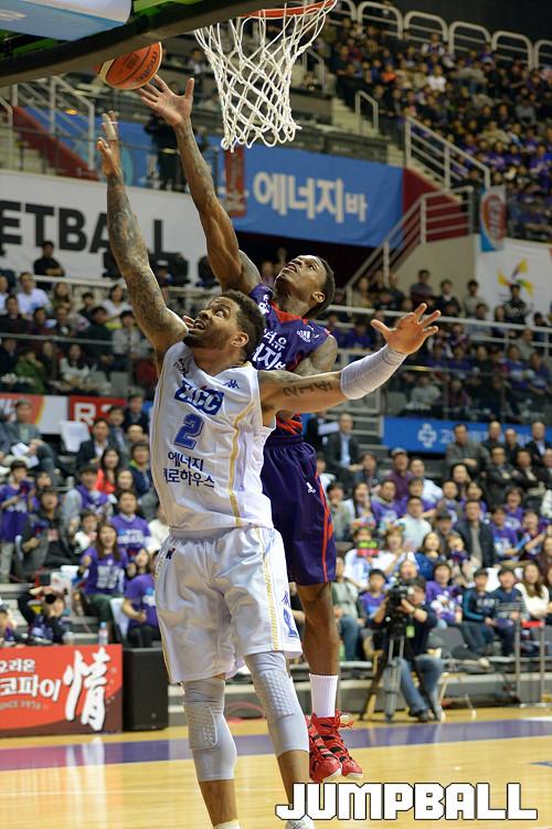 23일 고양 실내체육관에서 열린 '2015-2016 KCC 프로농구' 챔피온 결정전 고양 오리온 과 전주 KCC 의 3차전 경기, 오리온 조 잭슨이 kcc 에밋을 뛰어넘으며 팁인슛을 노리고있다.