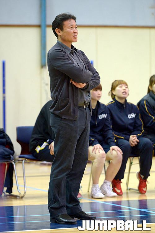 25일 춘천 한림성심대학교 체육관에서 열린 2016 남녀 대학농구 정규리그 한림성심대와 수원대의 경기에서 수원대 조성원 감독이 표정을 찡그리며 경기를 지켜보고있다.