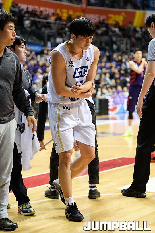 [점프볼=고양/유용우 기자] 25일 고양 실내체육관에서 열린 '2015-2016 KCC 프로농구' 고양 오리온과 전주 KCC의 챔피언결정전 4차전 경기, KCC 신명호가 파울로 부상을 당하고 있다.