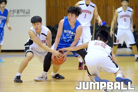 01일 광주 조선대 체육관에서 열린 2016 남녀 대학농구 정규리그 조선대 와 명지대의 경기, 명지대 김진성이 조선대 정해원, 신철민의 수비에 고전을 하고있다.