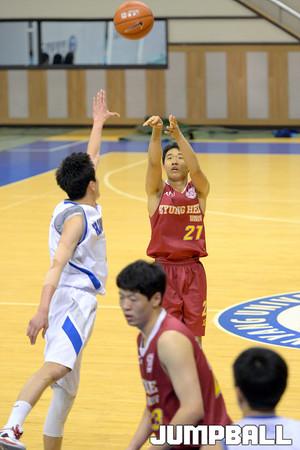05일 한양대 올림픽 체육관에서 열린 2016 남녀 대학농구 정규리그 한양대 와 경희대의 경기, 한양대 유현준이 경희대 이민영의 수비를 피해 골밑슛을 시도하고있다.
