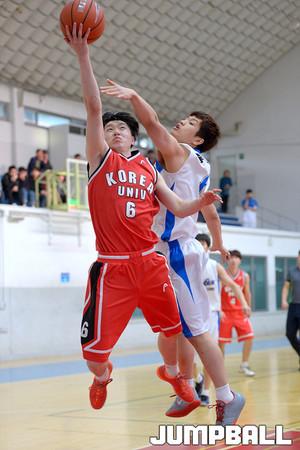 07일 동국대 체육관에서 열린 2016 남녀 대학농구 정규리그 동국대 와 고려대의 경기, 동국대 김승준이 고려대 이종현의 수비를 피해 3점슛을 시도하고있다.