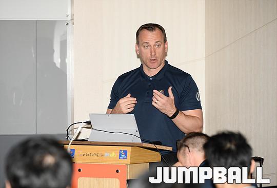 18일 고양 종합경기장 1층 인터뷰실에서 열린 'FIBA 심판 캠프'에서 스티브 세이벨(Steve Seibel, 캐나다) 現FIBA 심판 강사가 어제 촬영한 영상을 보며 강의를 진행하고 있다.