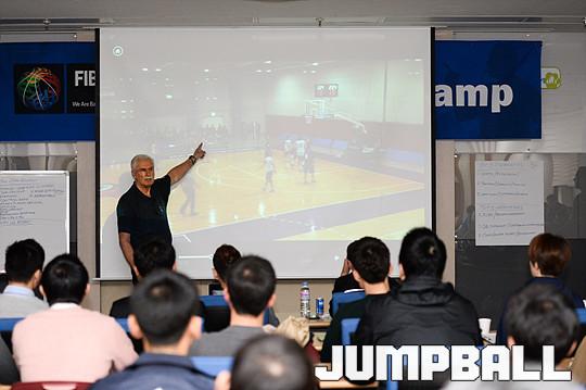 [점프볼=고양/유용우 기자] FIBA(국제농구연맹)는 오는 17일부터 20일까지 고양 실내체육관 보조 경기장 및 고양 종합경기장 1층 인터뷰실에서 ‘FIBA 심판 캠프’를 개최한다. 대한민국농구협회, KBL, WKBL 소속 심판을 대상으로 하는 이번 캠프는 FIBA 경기 규칙의 교육을 통해 심판 기량을 발전시키고 육성하기 위한 목적으로 시행되며, 캠프 참가자를 대상으로 철저한 테스트를 실시하여 향후 FIBA 주최 국제대회에 심판으로 초청된다. 심판 캠프 강사로는 칼 융브랜드(Carl Jungebrand, 핀란드) 現FIBA 심판위원장, 코스타스 리가스(Costas Rigas, 그리스) 前유로리그 심판위원장 및 기술위원장, 스티브 세이벨(Steve Seibel, 캐나다) 現FIBA 심판 강사 및 알레한드로 바퀘라(Alejandro Vaquera, 스페인) 現 FIBA 심판 체력 트레이너 등 4명의 강사가 참여한다. 18일 고양 종합경기장 1층 인터뷰실에서 열린 'FIBA 심판 캠프'에서 코스타스 리가스(Costas Rigas, 그리스) 前유로리그 심판위원장이 강의를 진행하고 있다. |