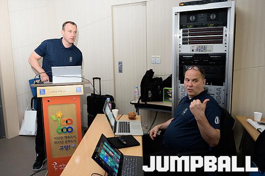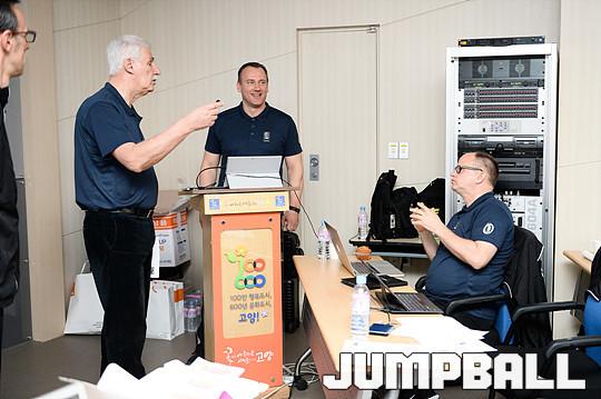 18일 고양 종합경기장 1층 인터뷰실에서 열린 'FIBA 심판 캠프'에서 오전 수업을 마치고 강사들이 모여 의견을 교환하고 있다.