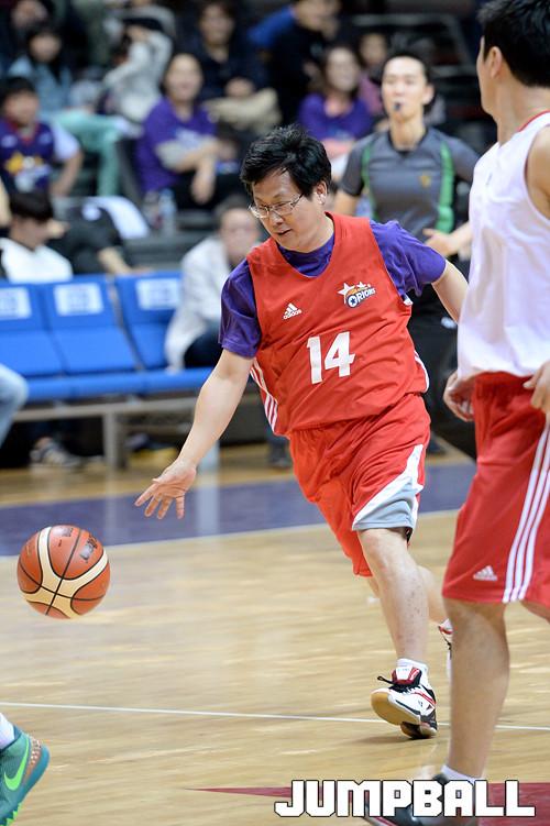 연예인팀에 합류한 최성 고양시장이 드리블을 하며 돌파를 시도하고있다.