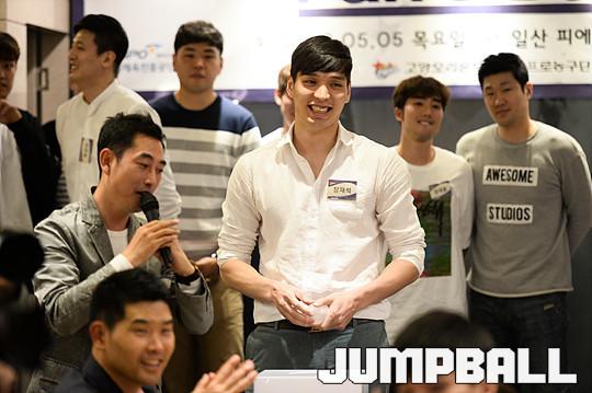 [점프볼=고양/유용우 기자] 14년 만에 우승을 거머쥔 프로농구 고양 오리온 농구단이 성원해준 팬들을 위해 우승 기념 팬 페스티벌을 진행하였다. 어린이날인 5일 고양 오리온 선수들이 연고지 고양에서 진행중인 2016 고양국제꽃박람회내 야외무대에서 팬들을 위한 사인회를 가졌다. 5시부터는 장소를 옮겨 15-16 시즌동안 수고한 오리온 크리에이터에게 수료식을 진행하고, 이후 팬들과 선수들이 어울려 식사와 즐거운 레크레이션 시간을 가졌다. 장재석이 팬들과 함께할 테이블을 추첨한뒤 웃고 있다.