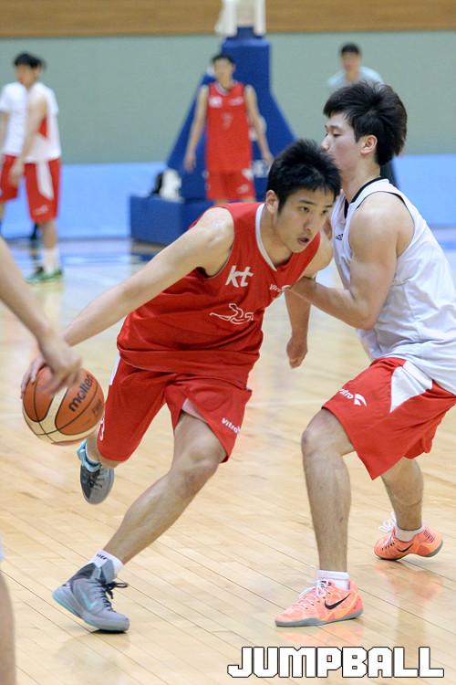 19일 부산 KT 의 비시즌 훈련현장을 찾았다. 조동현 감독의 지휘아래 KT 선수들은 기초체력훈련과 수비훈련등을 하고있었다. 강호연이 김우람의 수비를 제치고 돌파를 시도하고있다.