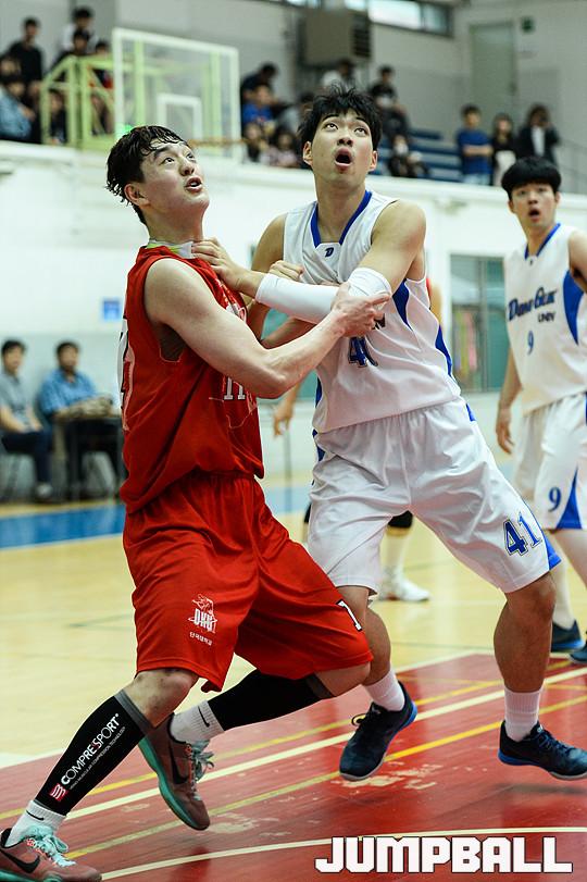 [점프볼=필동/유용우 기자] 25일 동국대체육관에서 열린 '2016 남녀 대학농구 정규리그' 동국대와 단국대의 경기, 동국대 홍석민과 단국대 홍순규가 자리다툼을 벌이고 있다.