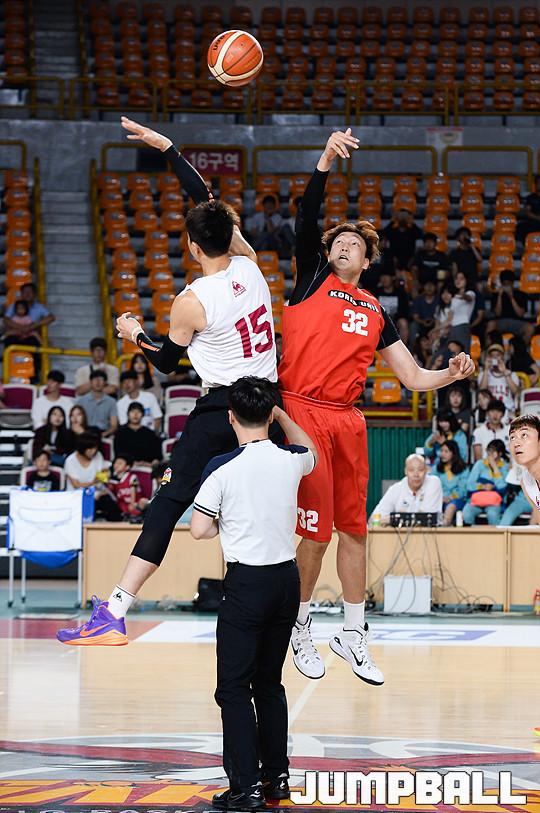 [점프볼/창원=유용우 기자] LG가 팬들을 위해 준비한 '두드림 데이'의 첫 번째 이벤트로 9일 오후 6시와 10일 낮 3시 30분에 홈구장인 창원실내체육관에서 공개적으로 고려대와 맞대결을 펼친다. 국가대표팀의 두 기둥, 김종규(207cm,C)와 이종현(206cm, C)의 맞대결로 큰 관심을 받고 있다. 9일 창원 실내체육관에서 열린 창원 LG와 고려대의 친선경기 1차전, LG 김종규와 고려대 이종현이 점프볼로 경기를 시작하고 있다.