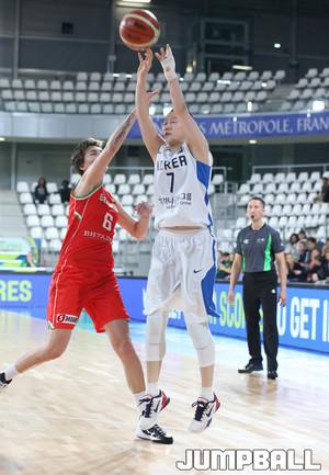 15일 프랑스 낭트 라 트로 카디에 메티로 폴리탄 체육관에서 열리는 2016 리우올림픽 최종예선전, 한국과 벨라루스의 경기에서 여자농구대표팀의 양지희가 자신 보다 큰 선수들을 상대로 골밑 공격을 펼치고 있다.
