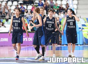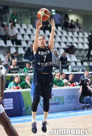 18일 프랑스 낭트 라 트로 카디에 메트로 폴리탄 체육관에서 열린 2016리우 올림픽 여자농구 최종예선전 패자 1회전 한국과 쿠바의 경기에서 양지희가 상대 수비를 앞에 두고서 움직이면서 훅슛으로 공격을 감행하고 있다