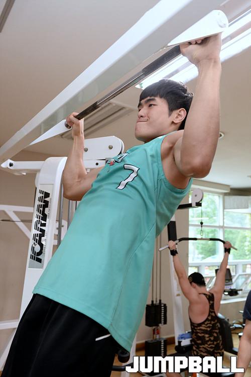 김동희가 웨이트장에서 턱걸이 운동을 하고있다.