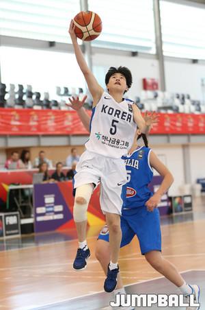한국 U17여자농구대표팀은 한국 시간 24일 저녁에 열린 2016 FIBA U17 여자농구대회 예선 두 번째 이탈리아와의 경기에서 박인아가 상대 수비를 뚫고 골밑으로 파고들어 슛을 시도하고 있다.