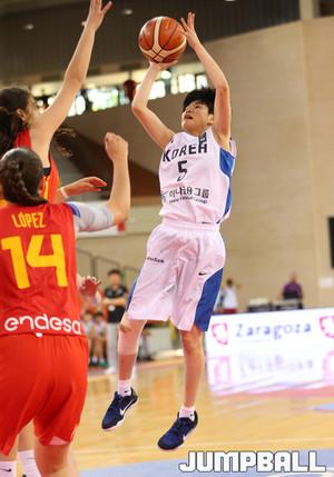 한국 U17여자농구대표팀은 한국시간 28일 새벽 스페인 사라고사 시골로 체육관에 열린 2016 FIBA U17 여자농구대회 14강전에서 한국 U17여자농구대표팀에 박인아와 박지현이 스페인 선수와 리바운드 싸움을 펼치고 있다.