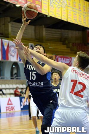 23일 이란(테헤란)에서 열린 제24회 FIBA U18 아시아농구선수권대회 한국 과 레바논의 경기. 신민석, 한승희가 레바논을 압박하며 수비를 하고있다.