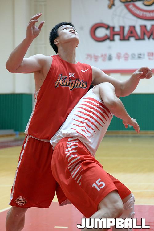 09일 용인 SK 나이츠 체육관에서 열린 SK 나이츠와 KT 소닉붐의 연습경기, SK 송창무가 KT 민성주와 리바운드 다툼을 하고있다.