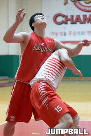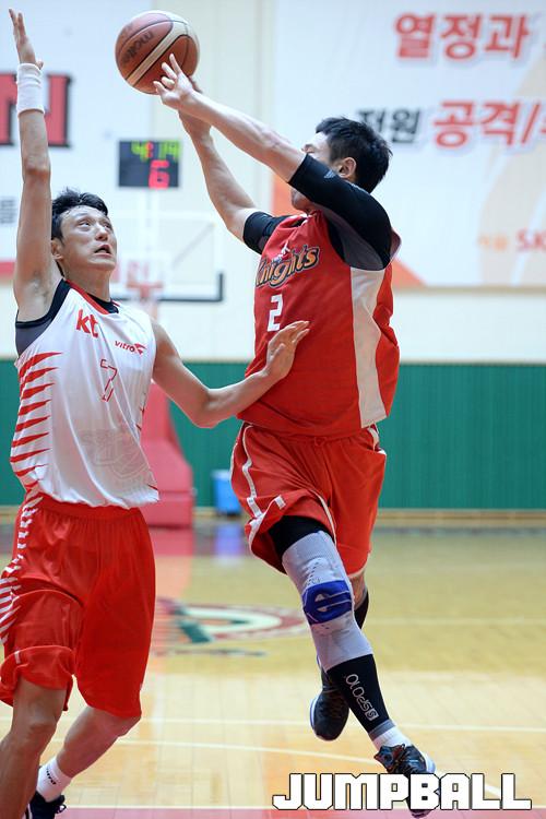 09일 용인 SK 나이츠 체육관에서 열린 SK 나이츠와 KT 소닉붐의 연습경기, SK 이정석이 골밑 돌파를 하다 수비를 속이고 백패스를 해주고있다.