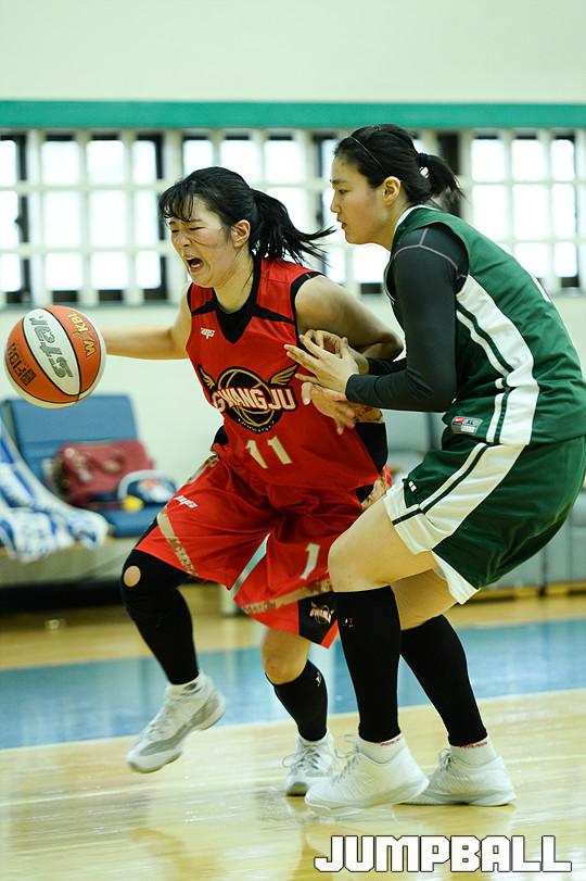 [점프볼=종로/유용우 기자] 10일 종로에 위치한 KEB하나은행 연습체육관에서 열린 KEB하나은행과 광주대의 연습경기, 광주대 우수진이 돌파를 시도하고 있다.