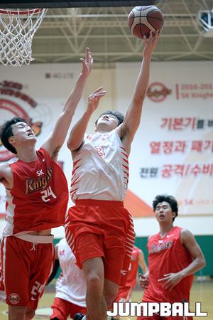 10일 인천 삼산보조경기장에서 열린 인천 전자랜드 와 상무 의 연습경기, 전자랜드 정효근이 상무 김승원의 수비를 피해 골밑슛을 시도하고있다.