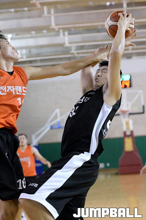 10일 인천 삼산보조경기장에서 열린 인천 전자랜드 와 상무 의 연습경기, 상무 김승원이 전자랜드 정효근과 리바운드 다툼을 하고있다.