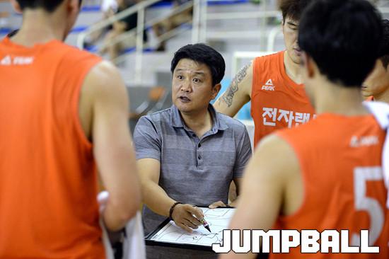 10일 인천 삼산보조경기장에서 열린 인천 전자랜드 와 상무 의 연습경기, 전자랜드 유도훈 감독이 선수들에게 작전 지시를 하고있다.