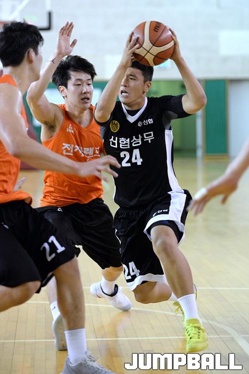 10일 인천 삼산보조경기장에서 열린 인천 전자랜드 와 상무 의 연습경기, 상무 박재현이 골밑으로 돌파를 시도하고있다.