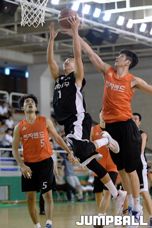 10일 인천 삼산보조경기장에서 열린 인천 전자랜드 와 상무 의 연습경기, 상무 성재준이 빠른 돌파에 이어 레이업슛을 시도하고있다.