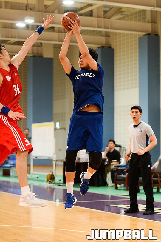 [점프볼=고양/유용우 기자] 10일 고양 종합체육관내 보조체육관에서 열린 고양 오리온과 연세대의 연습경기, 연세대 안영준이 3쿼터 막판 버져비터슛을 성공시키고 있다.