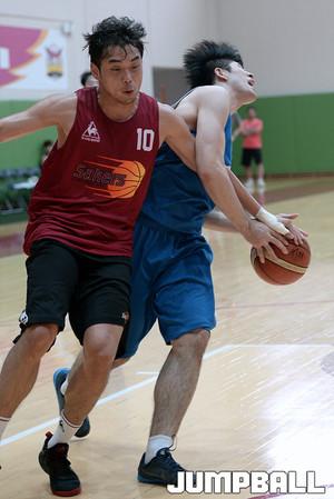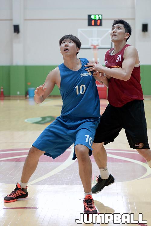 11일 이천 챔피언스파크에서 열린 창원 LG 와 동국대 의 연습 경기, 동국대 윤홍규가 LG 기승호를 상대로 박스아웃을 하고있다.