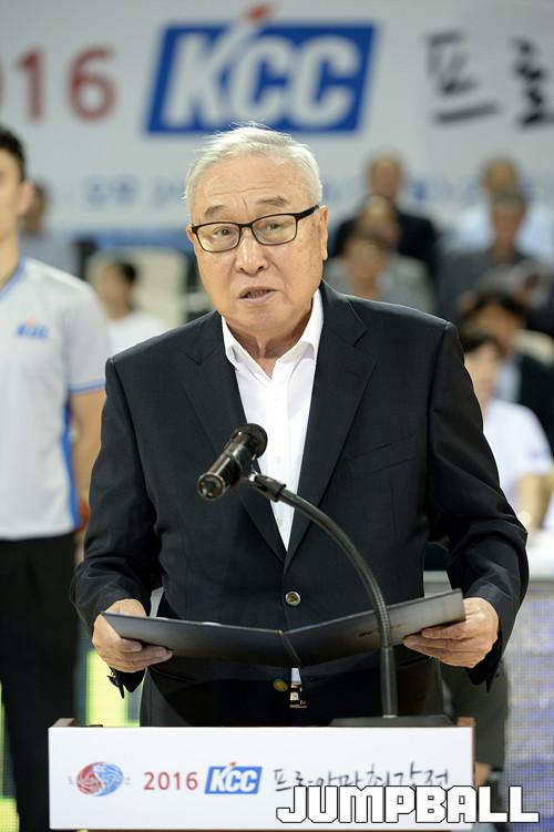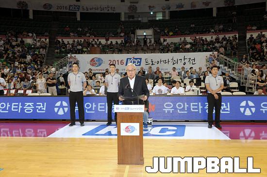 21일 잠실 학생체육관에서 열린 2016 KCC 프로-아마 최강전 첫날 삼성 - 고려대 의 경기에 앞서 김영기 총재가 개회선언을 하고있다.