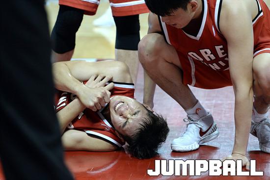 21일 잠실 학생체육관에서 열린 2016 KCC 프로-아마 최강전 첫날 삼성 - 고려대 의 경기, 고려대 정희원이 볼다툼을 하다 등으로 떨어지면서 고통을 호소하고있다.