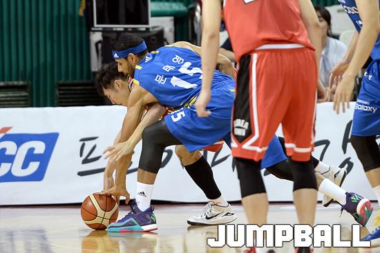 21일 잠실 학생체육관에서 열린 2016 KCC 프로-아마 최강전 첫날 삼성 - 고려대 의 경기, 삼성 문태영이 볼다툼을 하고있다.