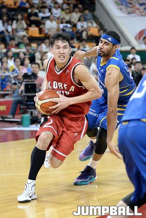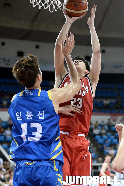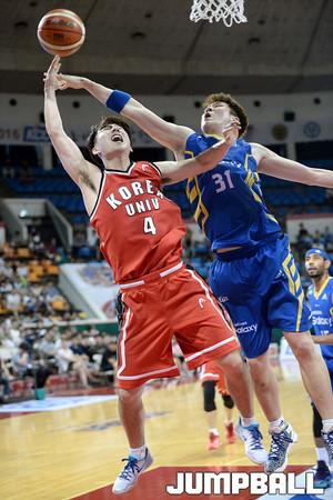 21일 잠실 학생체육관에서 열린 2016 KCC 프로-아마 최강전 첫날 삼성 - 고려대 의 경기, 고려대 박준영이 삼성 임동섭의 수비를 피해 골밑슛을 시도하고있다.