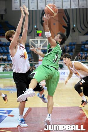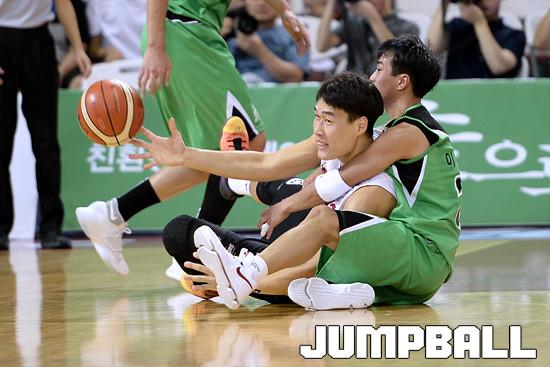 21일 잠실 학생체육관에서 열린 2016 KCC 프로-아마 최강전 첫날 건국대 - LG 의 경기, LG 류종현이 건국대 이승희와 볼다툼을 하고있다.