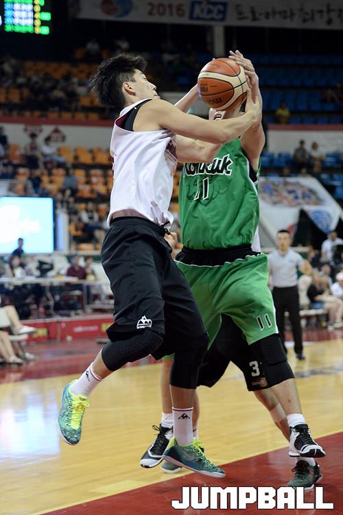 21일 잠실 학생체육관에서 열린 2016 KCC 프로-아마 최강전 첫날 건국대 - LG 의 경기, LG 조상열이 건국대 김재중과 리바운드를 다투고있다.